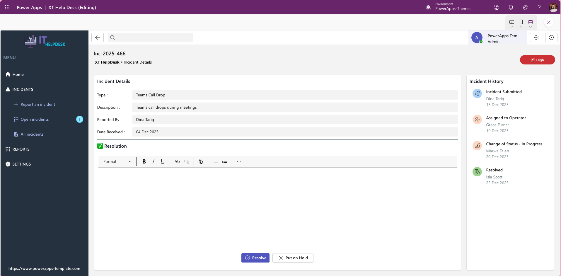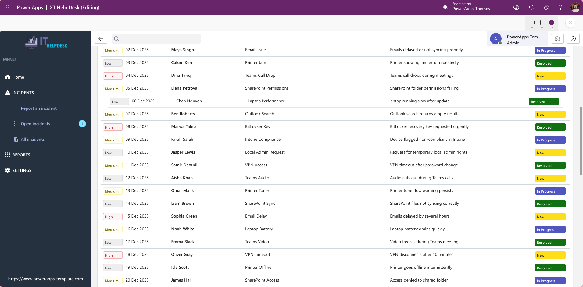 Kickstart your IT Helpdesk or incident management solution with XT HelpDesk, a ready-to-use Power Apps Canvas template designed for speed and simplicity. This template provides a modern, intuitive interface for tracking, managing, and resolving IT incidents efficiently.