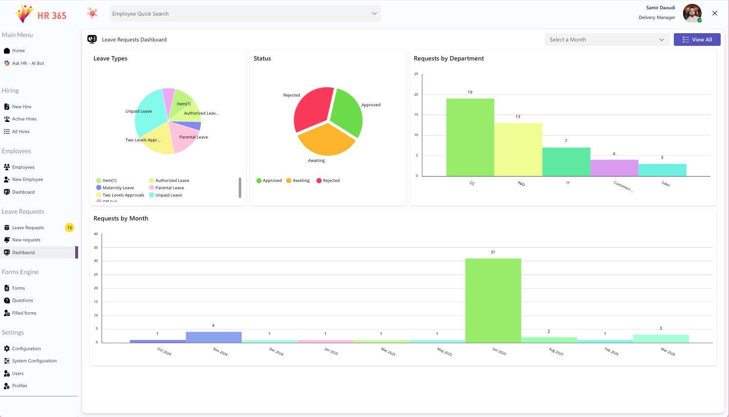 HR365 simplifies time‑off management by letting employees request leave easily, managers approve in one click, and calendars sync automatically—giving clear visibility of balances and team availability.