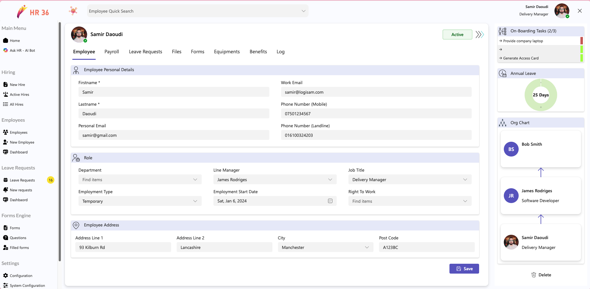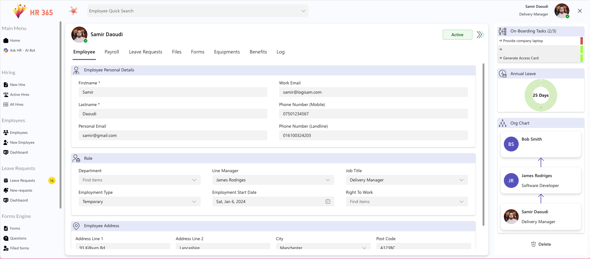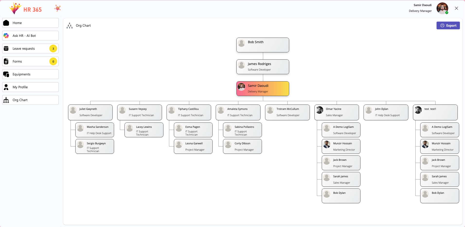 HR365 provides a dynamic organisational chart and searchable people directory, giving clear visibility of reporting lines, departments, roles, and contacts—helping employees connect and collaborate more easily.
